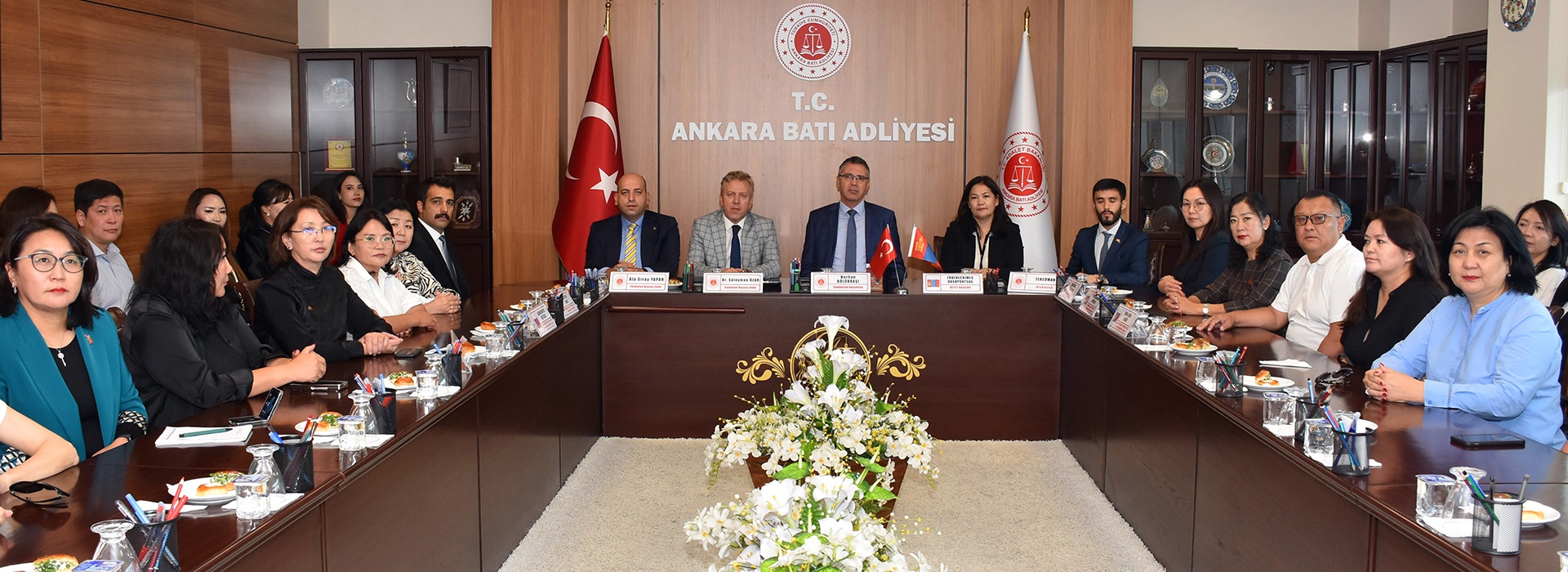 Türkiye Adalet Akademisinin uluslararası eğitim programları kapsamında ülkemize gelen Moğolistan Adalet Akademisi Başkanı Sayın Erdenechimeg Dashpuntsag ve Moğolistan Hâkimlerinden oluşan heyet, adliyemize çalışma ziyaretinde bulundu. Heyete Cumhuriyet Başsavcımız Sayın Burhan Bölükbaşı, Cumhuriyet Başsavcı Vekillerimiz Sayın Dr. Süleyman Özar ve Sayın Alp Giray Yapar eşlik etti.